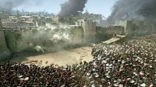 Teologiareformed.com Lukisan tentara Roma dipimpimpin Titus akan menjebol dan meruntuhkan tembok kota Yerusalem.