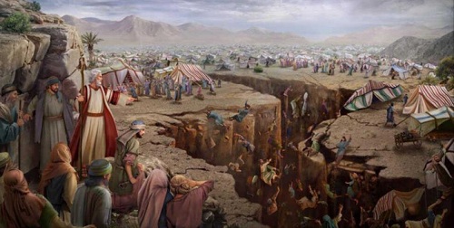 Satelit.gkagloria.id. Lukisan tentang Korah, Datan, Abiram dan pengikutnya yang memberontak pada nabi Musatertelan bumi yang terbelah.