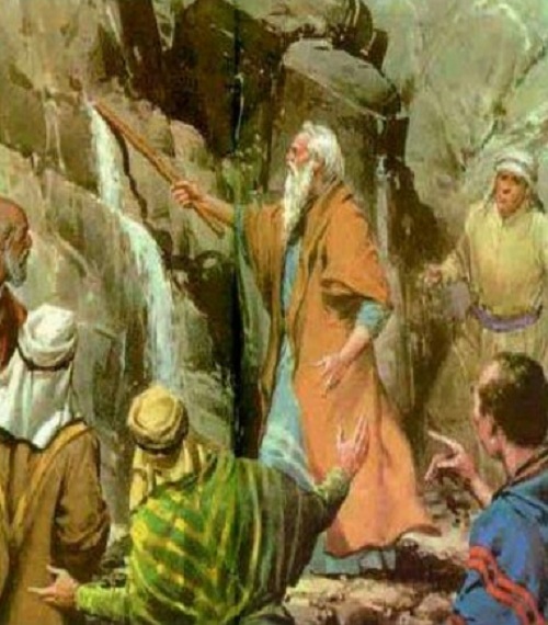 Musa mengambil tongkatnya (dari kemah suci yang diletakkan didepan tabut), dan mengumpulkan bani Israel untuk dibawa ke bukit batu. Nabi Musa diperintah untuk mengatakan kepada sebuah batu itu supaya (bani Israel) diberi airnya. Demikianlah engkau mengeluarkan air dari bukit batu itu bagi mereka dan memberi minum umat itu serta ternaknya.