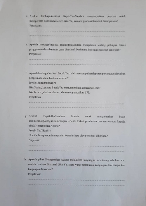 Pada poin 1.g) BPK mempertanyakn apakah pimpinan lembaga diminta untuk mengeluarkan biaya administrasi/potongan/sumbangan tertentu terkait kepada pihak Kemenag.