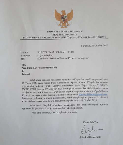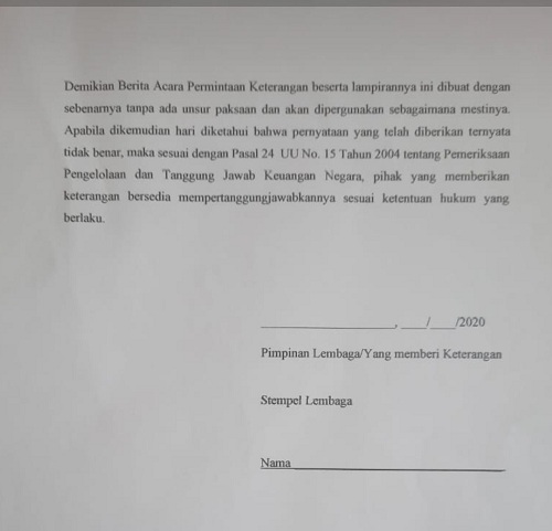 Diakhir konfirmasi tertulis itu BPK memperingatkan agar dalam mengisi berita acara dilakukan dengan sebenarnya. Sebab bila berbohong atau isian tidak sesuai akan diancam Pasal 24 UU No 15/2004.