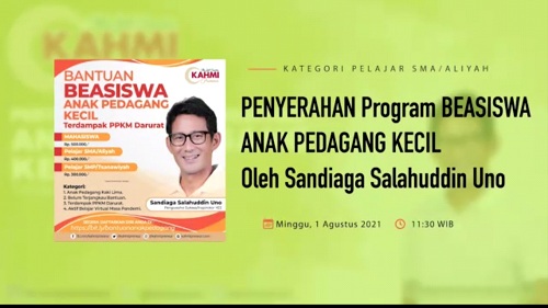 ZONASATUNEWS.COM, JAKARTA– Sebanyak 1.000 anak pedagang kecil menerima beasiswa yang diinisiasi KAHMIPreneur dengan pendanaan yang bersumber dari pengusaha nasional yang juga Menteri Pariwisata dan Ekonomi Kreatif Sandiaga Salahuddin Uno.