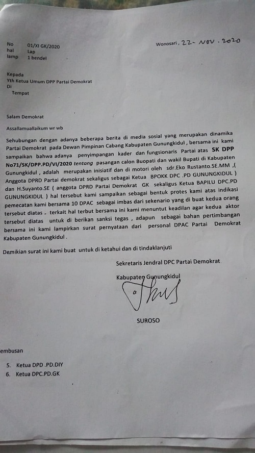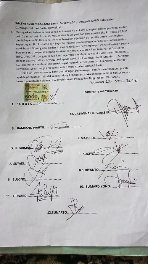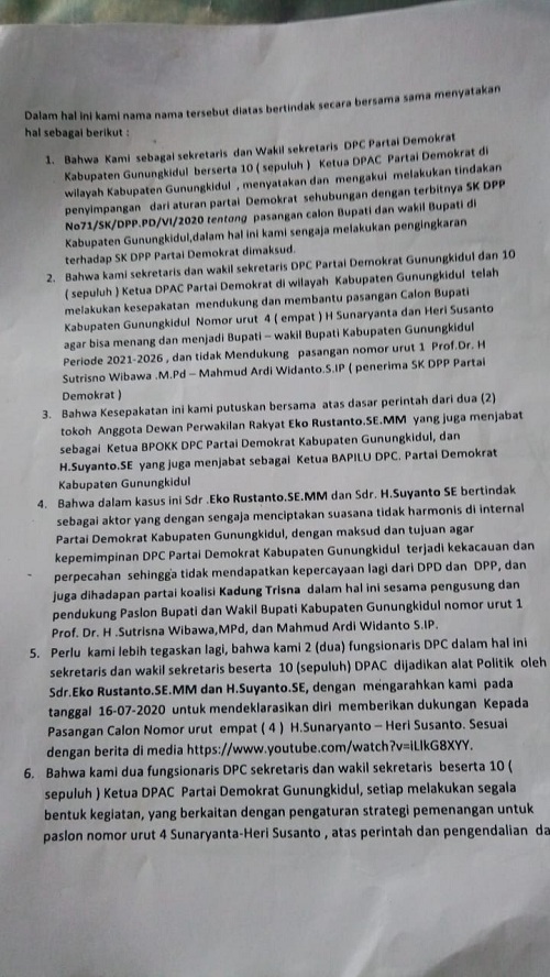 Rupanya langkah yang diambil dua fungsionaris DPC dan 10 PAC untuk mencari keadilan tidak main-main. Pasalnya, isi surat laporan 12 kader Demokrat Gunungkidul yang dilayangkan ke DPP, menyatakan bahwa surat yang sudah ditanda tanganinya bersama tesebut, adalah sebuah kebenaran, dan mereka mengaku bertanggung jawab atas segala dampak hukum dari surat pernyataan dimaksud.