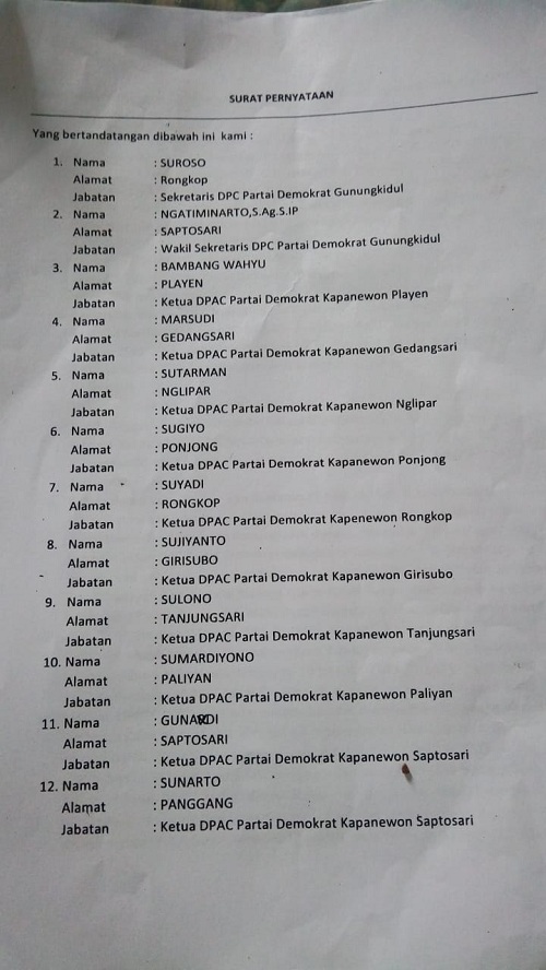 Adapun 12 kader Demokrat yang mengaku siap menghadapi berbagai kemungkinan dalam perseteruan politik ini adalah, Suroso Sekretaris DPC, Ngatiminarto, S.Ag.S.IP, Bambang Wahyu Ketua DPAC Playen, Marsudi Ketua DPAC Gedangsari, Sutarman Ketua DPAC Nglipar, Sugiyo DPAC Ponjong, Suyadi DPAC Rongkop, Sujitanto DPAC Girisubo, Sulono DPAC Tanjungsari, Sumardiyono DPAC Paliyan, Gunardi DPAC Saptosari, Sunarto DPAC Panggang.