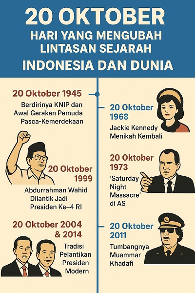 JAKARTA – Tanggal 20 Oktober bukan sekadar tanggal di kalender. Di baliknya, tersimpan jejak sejarah yang berlapis — dari momen krusial politik Indonesia hingga peristiwa besar dunia yang membentuk peradaban modern. Mari menelusuri bagaimana satu hari ini menjadi saksi perubahan besar di dua ranah: Indonesia dan dunia.