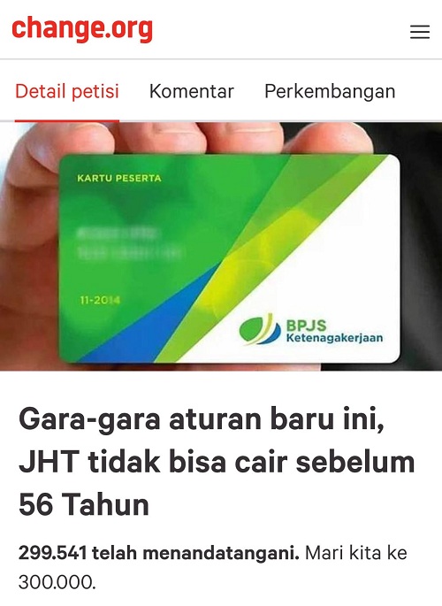 ZONASATUNEWS.COM, JAKARTA – Petisi di Change.org berjudul “Gara-gara aturan baru ini, JHT tidak bisa cair sebelum 56 tahun”, semakin banyak mendapat dukungan. Berdasarkan pantauan zonasatunews.com hingga pukul 18.00 WIB, MInggu (13/2/2022) tercatat sudah lebih dari 299.500 ribu tanda tangan.