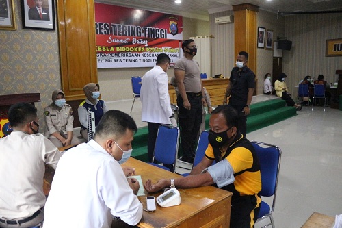 ZONASATUNEWS.COM, TEBINGTINGGI-SUMUT–Kapolres Tebing Tinggi AKBP AGUS SUGIYARSO, S.IK memimpin kegiatan pemeriksaan kesehatan Berkala personil polres Tebingtinggi Tahun 2021 di ruang aula kamtibmas Polres Tebingtinggi senin (22/3)