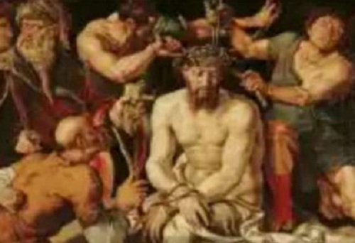 Hari berikutnya, para pejabat Mahkamah Agama Yahudi (Sanhedrin) dengan mengenakan jubah kebesaran berwarna ungu memasangkan pada kepala “ sosok Yesus “mahkota duri dan memberinya sebuah tongkat bambu.