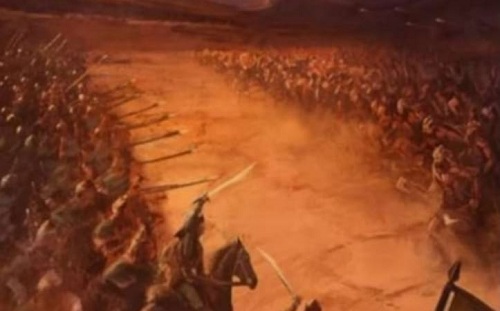 malangtimes.times.com lukisan Ilustrasi perang Uhud. Posisi kaum muslim di celah lembah yang menyempit di depan bukit.