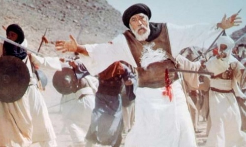 Telegraph.co.uk foto dari film the message, yang menggambarkan dengan tepat tombak Wahsyi menembus perut Hamzah di perang Uhud pada medan perang lembah gunung Uhud.