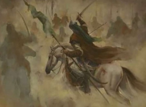 Telegraph.co.uk foto dari film the message, yang menggambarkan dengan tepat tombak Wahsyi menembus perut Hamzah di perang Uhud pada medan perang lembah gunung Uhud.