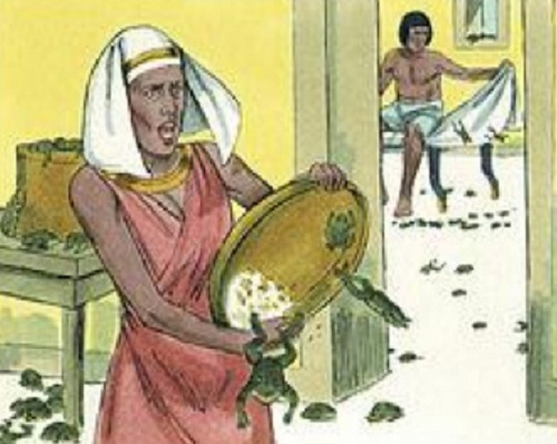 Katak tersebut kemudian menyerbu dan memasuki semua sudut dan ruang di luar dan di dalam rumah maupun istana merusak makanan di rumah sehingga tidak bisa dimakan, mengganggu orang yang sedang tidur, rumah dan istana menjadi tempat yang menjijikkan bahkan katak katak tersebut melompat dan menempel kebadan semua orang Mesir.Merenptah kemudian mendatangi nabi Musa dan Harun agar berdo’a kepada tuhannya untuk menghilangkan wabah katak tersebut dan sebagai kompensasinya adalah mengijinkan nabi Musa mengumpulkan dan membawa bani Israel ke padang gurun untuk menyelenggarakan ibadah kurban. Nabi Musa kemudian berdo’a kepada Allah memohon agar wabah katak dilenyapkan. Do’a Nabi Musa seketika dikabulkan, katak katak yang didaratan tiba tiba mati, kemudian dibuang olah masyarakat Mesir. Tapi karena jumlahnya luar biasa besarnya membuat bau busuk menyengat menebar di wilayah Mesir.