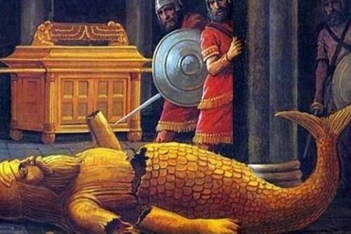 Di Asdod, ketika orang orang Filistin masuk ke kuil dagon, didapatinya patung dewa dagon jatuh di lantai dalam keadaan tengkurab dengan posisi kepalanya menyembah tabut Taurat. Para imam dagon kemudian mengembalikan patung dewa dagon ditempatnya. Namun keesokan harinya, mereka menjumpai patung dagon berserakan di lantai dengan kepala terpenggal dan kedua tangannya putus terlempar agak jauh. Masyarakat suku Filistin juga diserang wabah yang membuat kulit mereka keluar borok borok. Para imam kemudian memindahkan tabut Taurat ke kota Filistin lainnya yaitu kota Gat. Namun tidak lama kemudian masyarakat kota tersebut menderita sakit yang sama. Ketika akan dipindahkan ke kota Ekron, penduduknya menolak kotanya ditempati tabut Taurat milik bani Israel. Elloh menunjukkan kuasanya pada kaum penyembah berhala, meskipun mereka dapat mengalahkan kaum beriman.