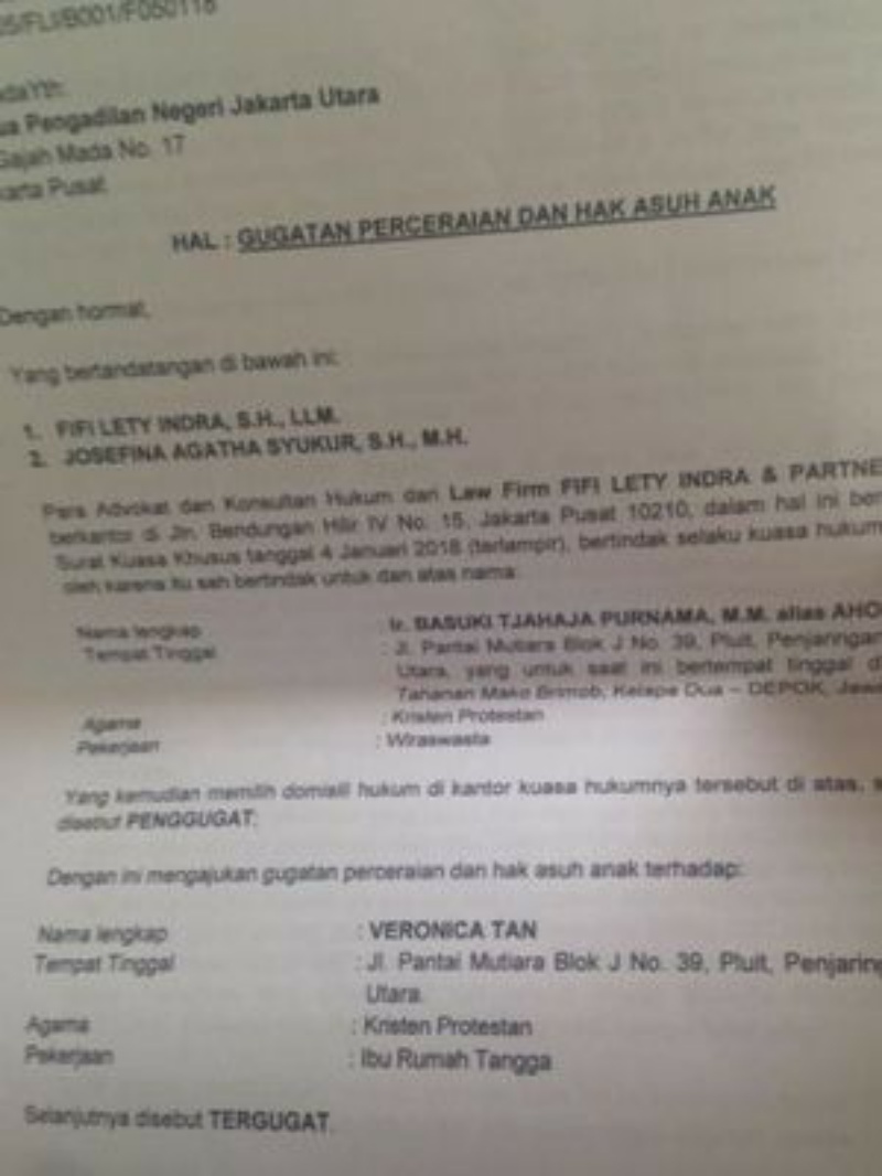 Minggu (7/1/2017) ini, beredar surat gugatan cerai Ahok kepada Veronica Tan. Mengenai kebenaran surat tersebut, Kompas.com masih menunggu konfirmasi dari pihak Pengadilan Negeri Jakarta Utara dan pihak Ahok.(kompas.com)