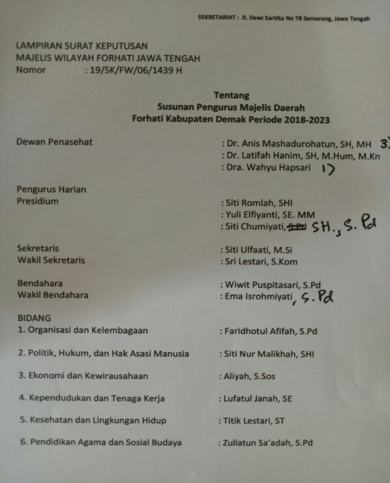 Sedang untuk Forhati Demak adalah Siti Romlah SH sebagai Ketua dan Siti ulfaati Msi sebagai sekretaris.