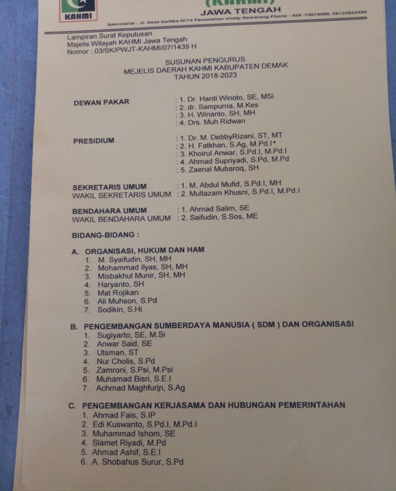 Pengurus Kahmi MD Demak yg dilantik adalah DR Debby Rizani ST MT sebagai korpresd dan M. Abdul Mufid, SpdI, MH sebagai sekretaris umum