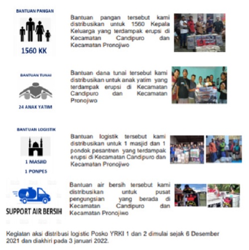 Kegiatan aksi distribusi logistic Posko YRKI 1 dan 2 dimulai sejak 6 Desember 2021 dan diakhiri pada 3 januari 2022.