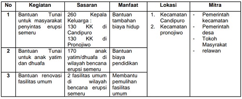 1 Bantuan Tunai untuk masyarakat penyintas erupsi semeru 260 Kepala Keluarga, meliputi: 130 KK di Candipuro, 130 KK di Pronojiwo. Bantuan tambahan biaya hidup meliputi: Kecamatan Candipuro dan Kecamatan Pronojiwo