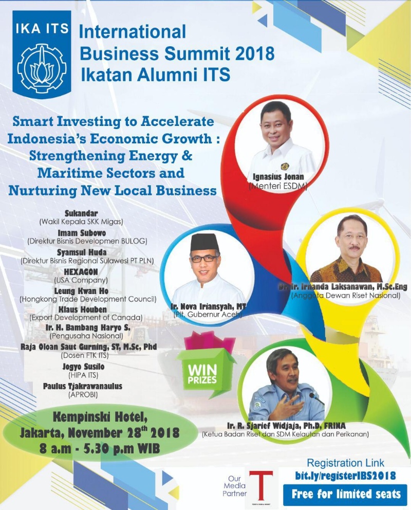 Jakarta-Indonesia Menjelang akhir tahun 2018, Pengurus Pusat Ikatan Alumni Institut Teknologi Sepuluh Nopember (PP IKA ITS) akan menggelar sebuah even bertaraf internasional yang diberi nama International Business Summit 2018. Tema yang akan diusung pada tahun ini adalah Smart Investing To Accelerate Indonesia’s Economic Growth: Strengthening Energy & Maritime Sector And Nurturing New Local Businesses.