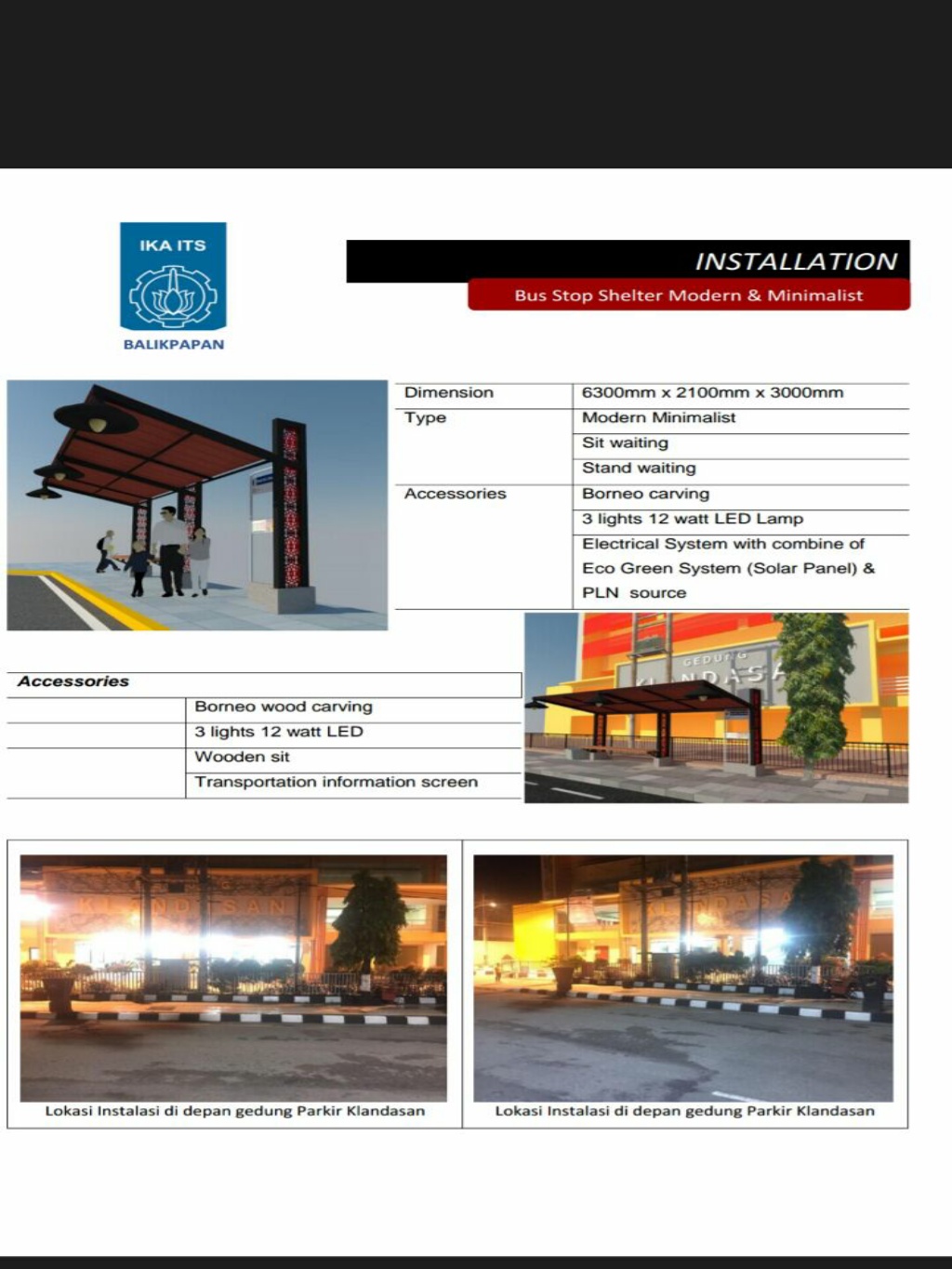 Shelter berlokasi di depan gedung parkir Klandasan. Electrical system menggunakan kombinasi eco green system (solar panel, tenaga panas matahari) dan PLN source.