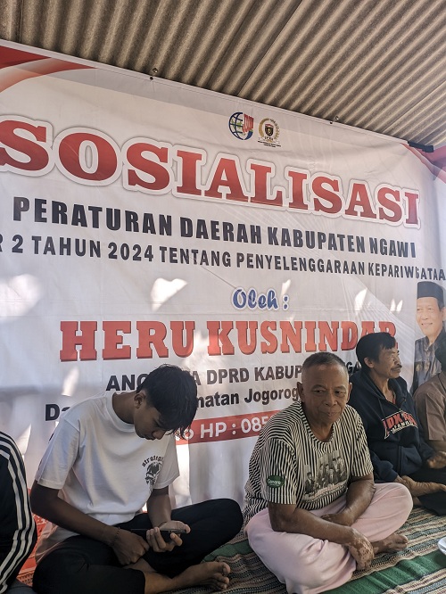 NGAWI – Pada pagi yang cerah di dua gazebo kembar diadakan Sosialisasi Peraturan Daerah Kabupaten Ngawi Nomor 2 Tahun 2024 Tentang Penyelenggaraan Kepariwisataan oleh Heru Kusnindar, anggota Komisi I DPRD Kabupaten Ngawi. Sosialisasi diadakan pada Rabu (9/ 7/2025), pukul 09.30 WIB