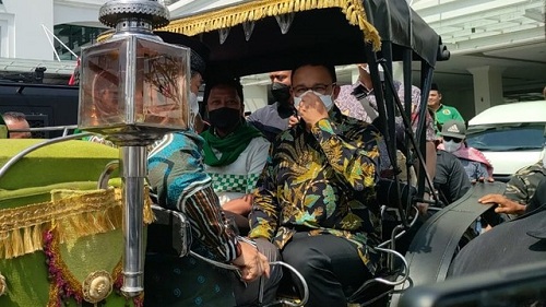 Gubernur DKI Jakarta Anies Baswedan naik kereta kuda menuju acara Harlah PPP di JEC, Kabupaten Bantul, DIY, Senin (31/1/2022) Foto: Arfiansyah Panji Purnandaru/kumparan