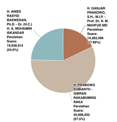 Berdasarkan perhitungan di website tersebut, pasangan Anies-Imin (01) mendapat 19.638.914 suara (24,6 persen), pasangan Prabowo-Gibran (02) mendapat 45.896.052 suara (57,5 persen), dan pasangan Ganjar-Mahfud (03) mendapat 14.282.586 suara (17,89 persen). Sehingga, total ketiga pasangan calon mendapat 79.817.552 suara, atau setara 59,85 persen dari 133.358.750 pemilih (suara).