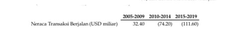 Defisit neraca Transaksi Berjalan (= transaksi internasional) terus memburuk, dari surplus 32,4 miliar dolar AS pada periode 2005-2009 menjadi defisit 74,2 miliar dolar AS pada periode 2010-2014, dan defisit membesar menjadi 111,6 miliar dolar AS pada periode 2015-2019.