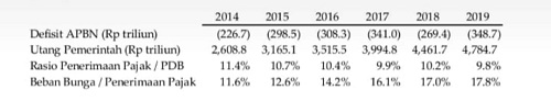 Kondisi keuangan negara juga semakin buruk dan rapuh. Defisit APBN (Anggaran Pendapatan dan Belanja Negara) membesar sehingga membuat utang pemerintah naik tajam dari Rp2.608,8 triliun pada 2014 menjadi Rp4.784,7 triliun pada 2019, atau naik 83,4 persen. Salah satu sebabnya karena penerimaan negara, khususnya penerimaan pajak, relatif melemah. Rasio Penerimaan Pajak terhadap PDB (Produk Domestik Bruto) turun dari 11,4 persen pada 2014 menjadi 9,8 persen pada 2019, menunjukkan kondisi fiskal semakin mengkhawatirkan. Penurunan Rasio Penerimaan Pajak ini mencerminkan kebijakan Tax Amnesty dan kebijakan fiskal gagal. Dampaknya beban bunga pinjaman juga meningkat tajam. Rasio Beban Bunga terhadap Penerimaan Pajak naik dari 11,6 persen (2014) menjadi 17,8 persen (2019).