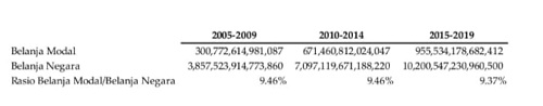 Banyak pihak klaim bahwa pemerintahan Jokowi berhasil dalam belanja “produktif” yaitu belanja modal dan infrastruktur. Dalam nilai nominal, Belanja Modal memang selalu naik setiap tahunnya karena kenaikan Pendapatan Negara dan Belanja Negara. Tetapi, berdasarkan nilai relatif terhadap Belanja Negara, rasio Belanja Modal terhadap Belanja Negara tersebut hanya 9,37 persen untuk periode 2015-2019. Rasio ini lebih rendah dari dua periode lima tahunan sebelumnya, yang keduanya mencapai 9,46 persen.