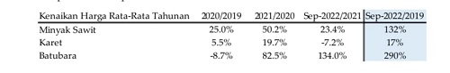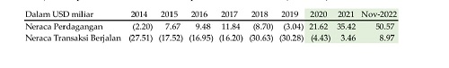 Kebangkitan neraca perdagangan dan neraca transaksi berjalan ini disebabkan oleh kenaikan tajam harga komoditas sejak Juni 2020, akibat kebijakan moneter global yang bersifat inflationary tersebut. Sebagai contoh, harga rata-rata minyak sawit selama 9 bulan pertama 2022 naik 132 persen dibandingkan dengan harga rata-rata tahunan 2019 (sebelum pandemi). Sedangkan harga batubara naik 290 persen untuk periode tersebut.