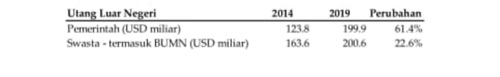 Defisit neraca transaksi berjalan ini membuat utang luar negeri melonjak dari 293,3 miliar dolar AS menjadi 403,6 miliar dolar AS selama lima tahun sejak 2014 hingga 2019. Penambahan utang luar negeri ini dimotori oleh pemerintah dan BUMN (swasta). Utang luar negeri pemerintah naik 61,4 persen dan swasta (termasuk BUMN) naik 22,6 persen, selama 5 tahun hingga akhir 2019.