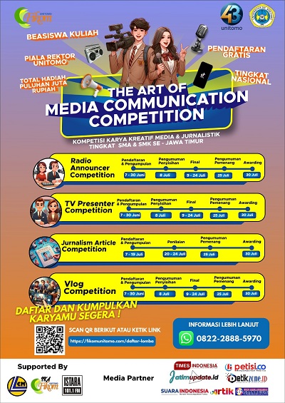SURABAYA — Fakultas Ilmu Komunikasi dengan bangga mengumumkan penyelenggaraan “The Art of Media Communication Competition,” sebuah ajang bergengsi yang dirancang untuk menampilkan dan mengembangkan bakat siswa SMA dan SMK di seluruh Indonesia dalam bidang Ilmu Komunikasi. Kompetisi ini bertujuan untuk mendorong kreativitas, meningkatkan keterampilan komunikasi, dan menginspirasi generasi profesional media di masa depan.