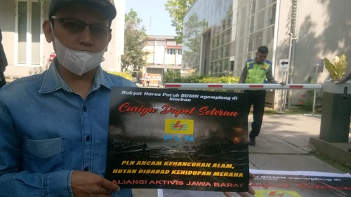 Korlap Aliansi Masyarakat Jawa Barat, Agus Satria dalam aksinya pada hari Jumat, 15 September 2023 melakukan aksi diam untuk menagih kewajiban PLN terhadap kewajiban kehutanan di sela kegiatan Forum Group Discussion (FGD) tentang Biodiversity Management Plan PLTA Upper Cisokan Pumped Storage (UCPS) 1040 MW di Hotel Malaka Kota Bandung.