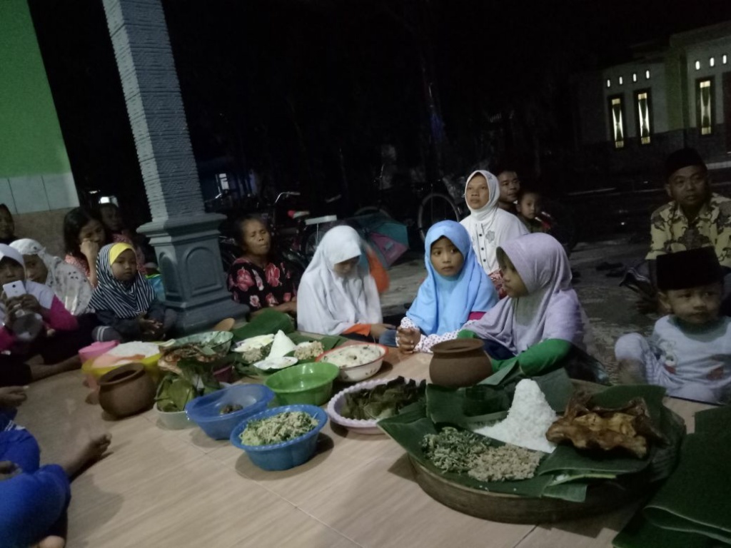 Selesai ritual sholat gerhana rupanya jamaah tidak langsung pulang. Duduk melingkar di serambi musholla sambil menikmati sodaqoh dari keluarga yang kebetulan anaknya sedang hamil.