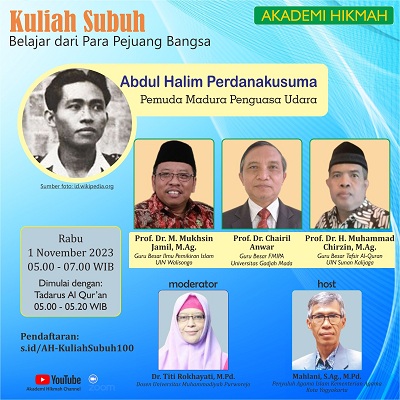 Pada hari Rabu 1 November 2023, menjelang peringatan Hari Pahlawan Nasional 10 November, Akademi Hikmah menyelenggarakan Kuliah Subuh Online Belajar dari Para Pejuang Bangsa episode ke-100, membahas salah seorang pahlawan nasional, bertajuk Abdul Halim Perdanakusuma, Pemuda Madura Penguasa Udasra. Menghadirkan tiga narasumber akademisi, Prof. Dr. Khairil Anwar, Guru Besar FMIPA Universitas Gadjah Mada, Prof. Dr. M. Mukhsin Jamil, M.Ag, Guru Besar Ilmu Pemikiran Islam UIN Semarang, dan penulis Prof. Dr. Muhammad Chirzin, Guru Besar Tafsir Al-Quran UIN Sunan Kalijaga.