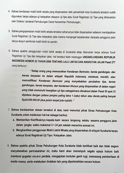 Taufiq juga menuntu agar dilakukan penghentian penggunaan mobil listrik wisata yang dioperasikan di wilayah Surakarta tanpa disetai surat registrasi uji type/uji kelayakan.