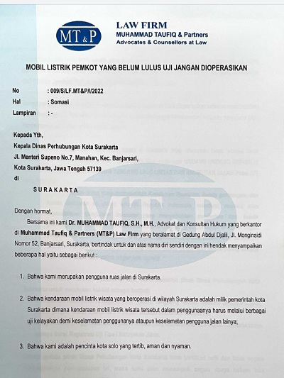 Dengan demikian, Taufiq dalam surat somasinya memandang mobil listrik wisata tersebut membahayakan keselamatan pengguna jalan dan penikmat mobil listrik itu sendiri.