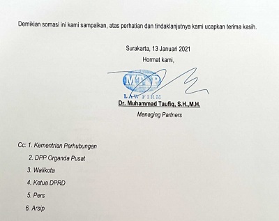 ZONASATUNEWS.COM, SOLO — Advokat dan Konsultan hukum Dr.Muhammad Taufiq, SH,MH dari kantor hukum Muhammad Taufiq & Partners Law Firm mensomasi Dinas Perhubungan Kota Surakarta.