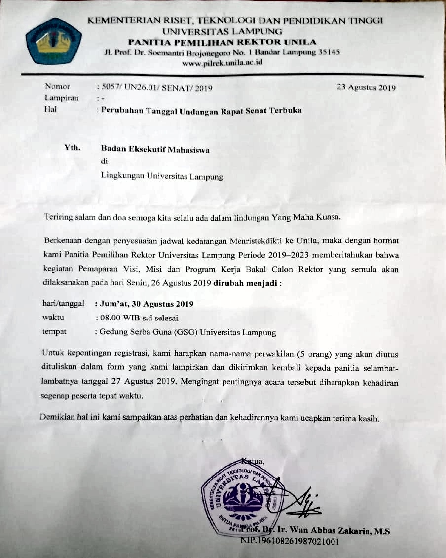 “Lucunya kampusku tercinta, ketika surat pemberitahuan Pemaparan Visi, Misi dan Program Kerja Bakal Calon Rektor di GSG UNILA telah tersebar berubah dari tanggal 26 menjadi 30 agustus 2019, dengan dalih ada beberapa anggota senat yang belum pulang menunaikan ibadah haji,” kata dia.