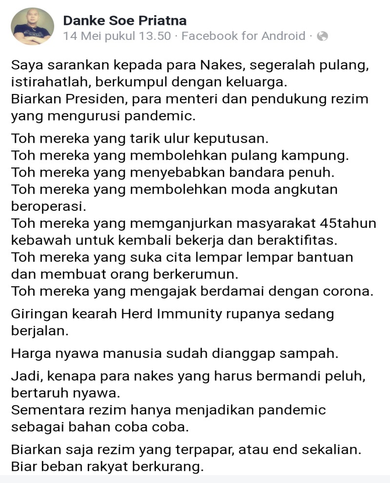 “Saya sarankan kepada para Nakes, segeralah pulang, istirahatlah, berkumpl dengan keluarga. Biarkan Presiden, para menteri dan pendukung rezim yang mengurusi pandemic.