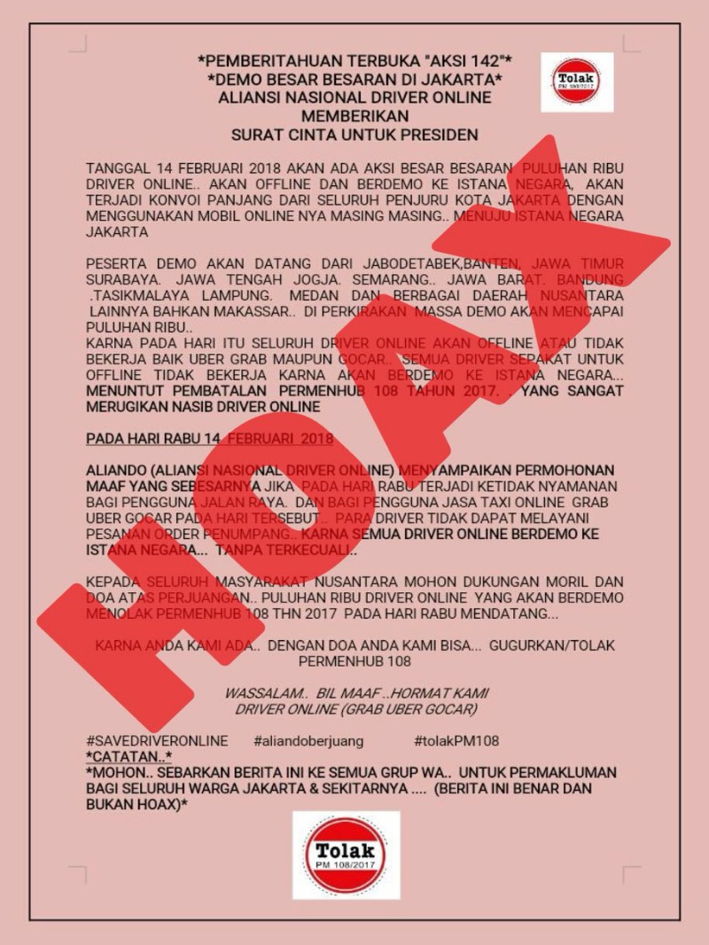 […] There you can find 93034 additional Information on that Topic: zonasatunews.com/nasional/beredar-selebaran-yang-diduga-hoax-puluhan-ribu-driver-online-akan-demo-ke-istana-14-februari-2018/ […]