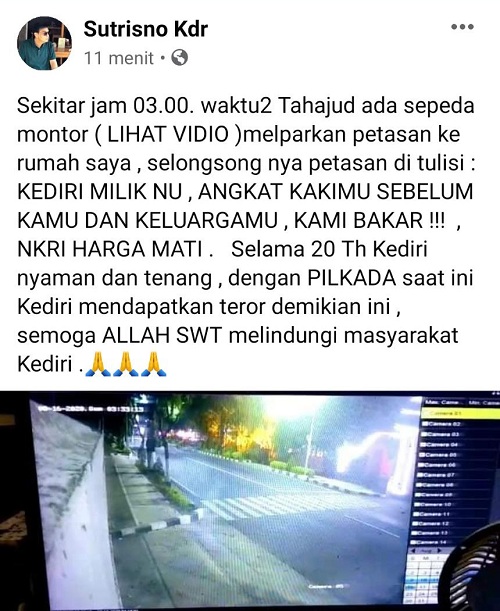 “Sekitar jam 03.00. Waktu2 Tahajud ada sepeda montor ( LIHAT VIDIO ) melemparkan petasan ke rumah saya , selongsong nya petasan di tulisi : KEDIRI MILIK NU , ANGKAT KAKIMU SEBELUM KAMU DAN KELUARGAMU , KAMI BAKAR !!! , NKRI HARGA MATI . Selama 20 Th Kediri nyaman dan tenang , dengan PILKADA saat ini Kediri mendapatkan teror demikian ini , semoga ALLAH SWT melindungi masyarakat Kediri’, tulis akun tersebut.