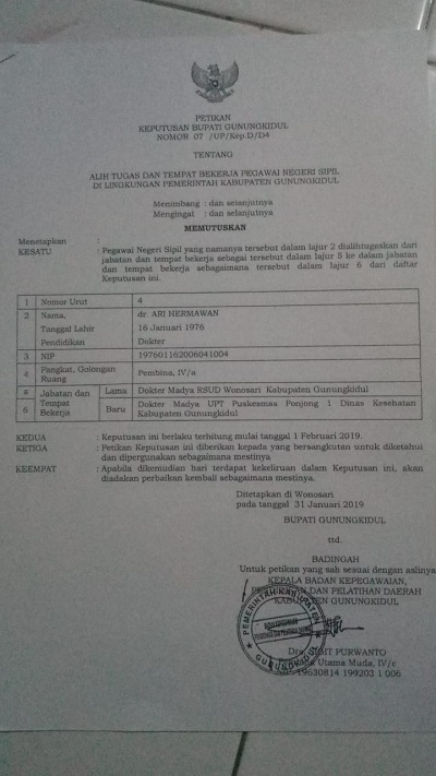SK mutasi dr. Ari Hermawan dari RSUD Wonosari ke Puskesmas Ponjong terhitung mulai tanggal 1 Februari 2019, dan ditetapkan pada tanggal 31 Januari 2019. Sedangkan dia, pada tanggal 31 Januari sampai dengan 28 Februari masih bertugas di IGD RSUD Wonosari.