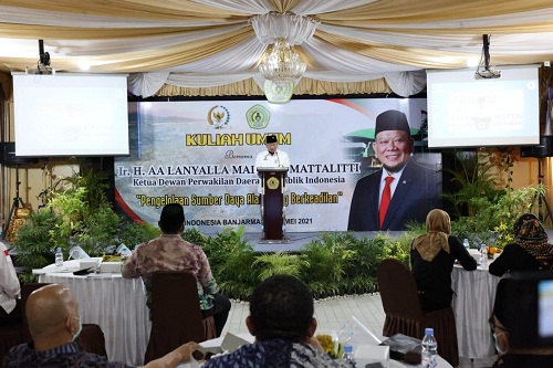 ZONASATUNEWS.COM, BANJARMASIN – Ketua DPD, AA LaNyalla Mahmud Mattalitti, mengupas Pasal 33 UUD 1945 mengenai koperasi, saat memberikan kuliah umum di Kampus STIE Indonesia, Banjarmasin, Kalimantan Selatan, Senin (24/5/2021).