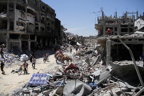 Warga Palestina berjalan saat mereka memeriksa kerusakan setelah pasukan Israel mundur dari kamp pengungsi Jabalia, menyusul penggerebekan, di Jalur Gaza utara, 31 Mei 2024. REUTERS/Mahmoud Issa
