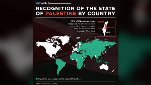 Sekitar 72% negara anggota PBB mengakui Palestina sebagai negara yang terdiri dari Gaza, Tepi Barat yang diduduki, dan Yerusalem Timur yang diduduki. (TRT World)