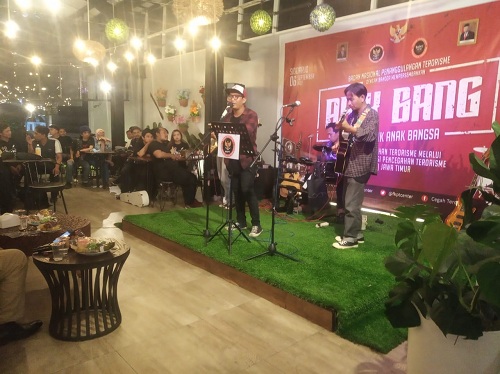 “Kegiatan ini kerja sama BNPT dengan forum koordinasi pencegahan terorisme (FKPT) provinsi Jawa Timur akan berlomba ke tingkat nasional. Mereka wajib menyanyikan lagu wajib ‘Salam Indonesia Harmoni’,” ujar mantan perwira polisi yang lama bertugas di Densus 88 tersebut.