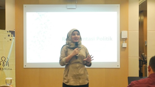 Pada sesi pertama, materi ‘Representasi dan Kapasitas Politik’ dipaparkan oleh Direktur Eksekutif Pusat Kajian Ilmu Politik Universitas Indonesia, Hurriyah. Menurutnya representasi terdapat dua makna, konsep perwakilan (caleg) dan keterwakilan (aspirasi). Berkaitan dengan hal itu, berbicara mengenai legislatif di Indonesia terdapat perwakilan kursi-kursi di legislatif, tapi keterwakilannya minim.