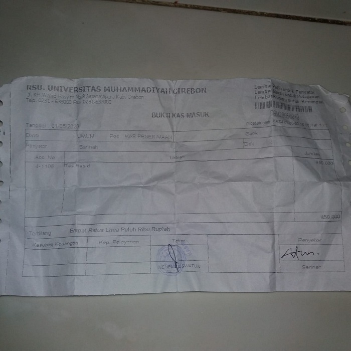 Pasien bernama Sarinah warga kab Cirebon Jawa Barat, di RS umc Cirebon 2 kali tes Covid-19 bayar Rp 450rb x 2 tes. Ybs pasien PBI BPJS kesehatan. Di Jakarta beragam harga tes Covid-19 nya dr Rp 550 ribu bahkan lebih